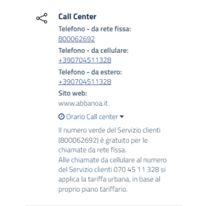 Prenotabile dal sito web di Abbanoa (link) o https://abbanoa.kioskbuk.it/intro.aspx o telefonicamente al numero 070 4511327 (il servizio telefonico di prenotazione appuntamenti è attivo nei giorni feriali dal lunedì al venerdì dalle 8.30 alle 13.00 e dalle 14.30 alle 16.00).