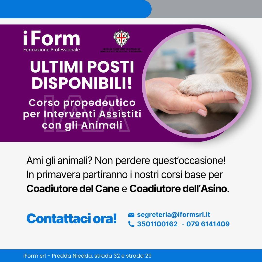 Al fine di favorire la formazione dell'Equipe Multidisciplinare che opera negli I.A.A. anche all'interno del Parco ma non esclusivamente - essendo praticabili con altri animali e in altri contesti -, il Comune di Ortueri invita chiunque sia interessato a prendere in considerazione l'opportunità formativa promossa da iForm, Ente accreditato dalla Regione Sardegna con Determinazione prot. N. 37583 del 07/08/2013. iForm organizza i seguenti corsi di formazione professionale, autorizzati dalla Regione Autonoma della Sardegna e adeguati alle Linee Guida Nazionali per gli IAA: